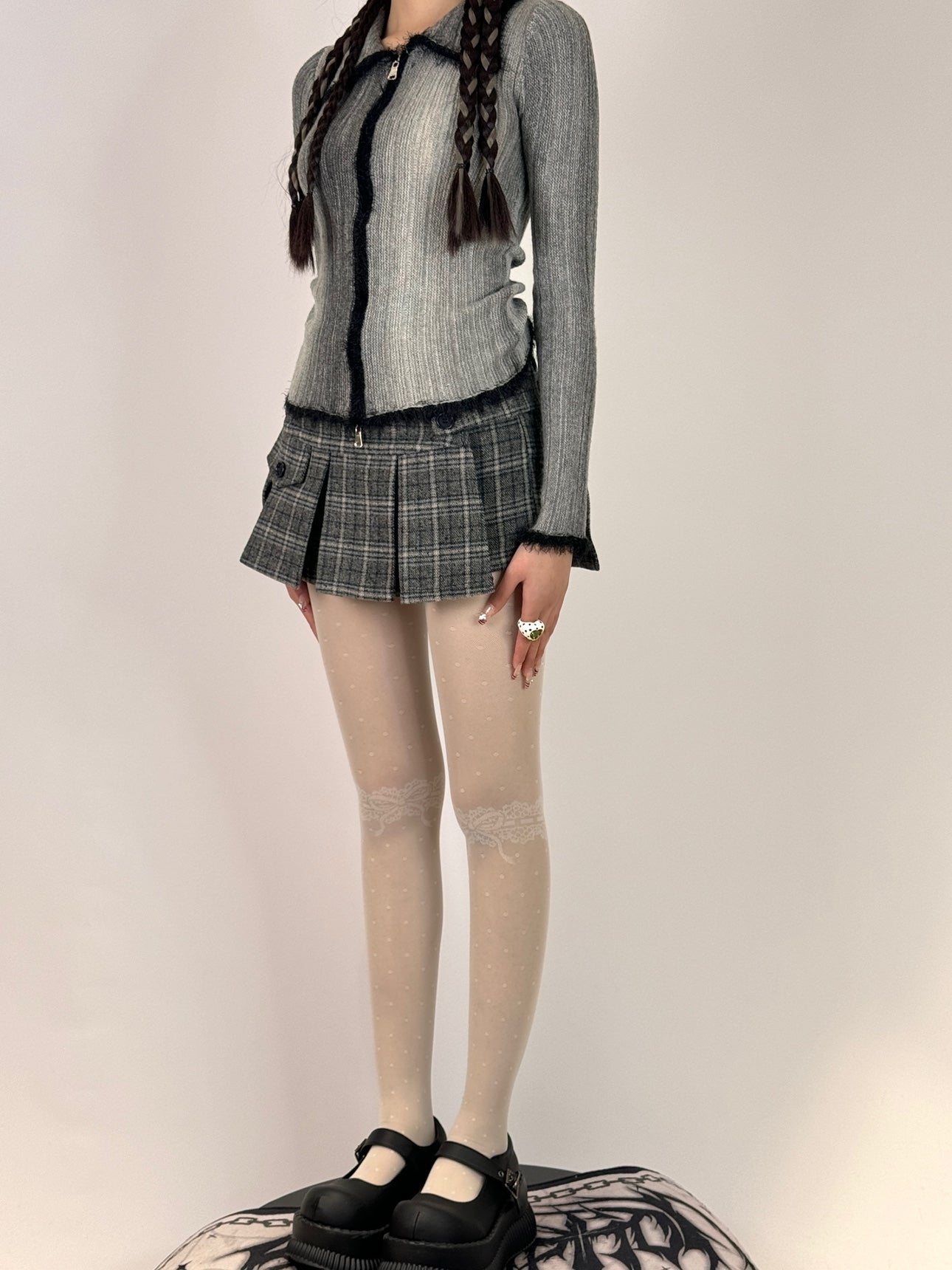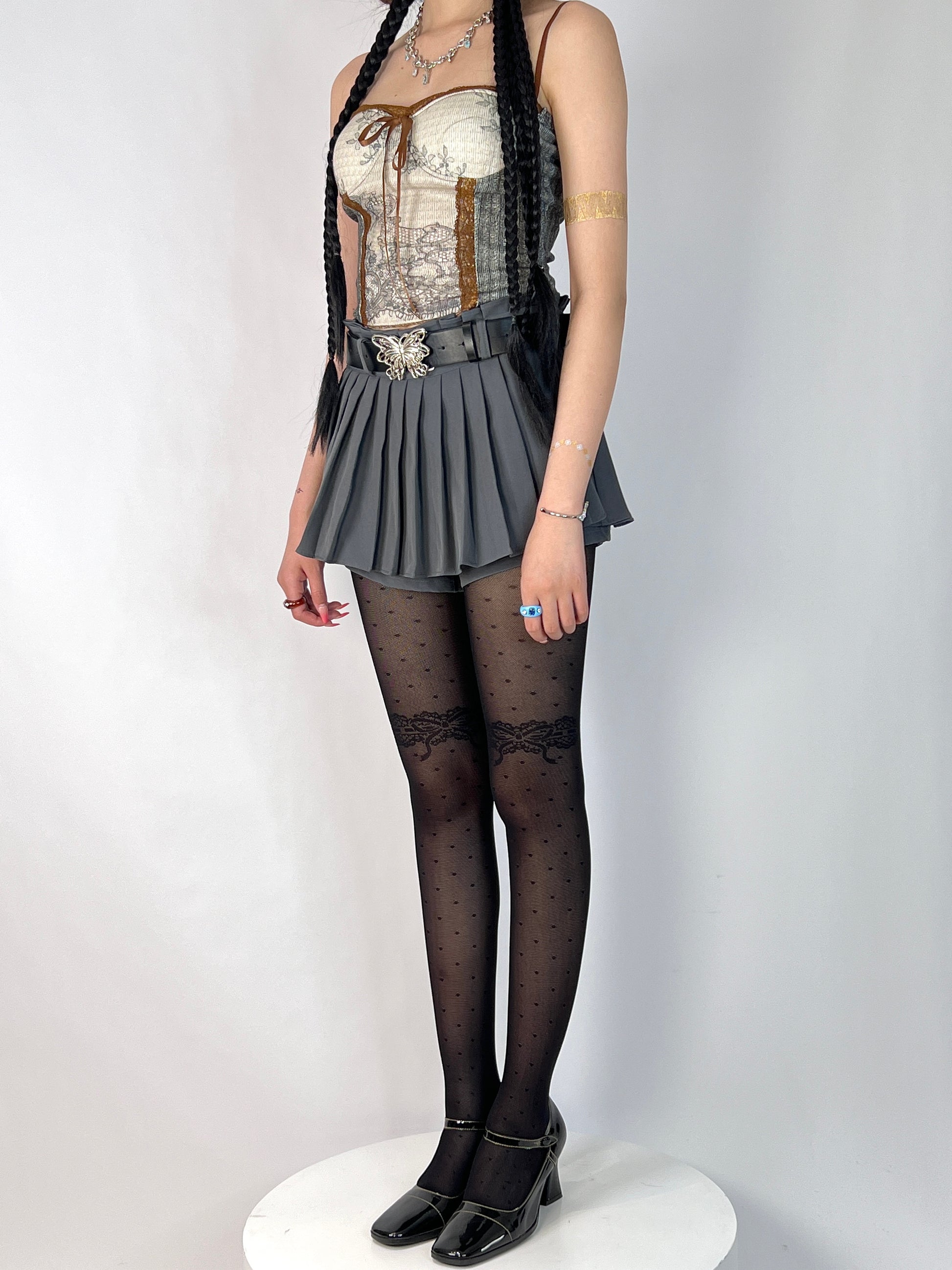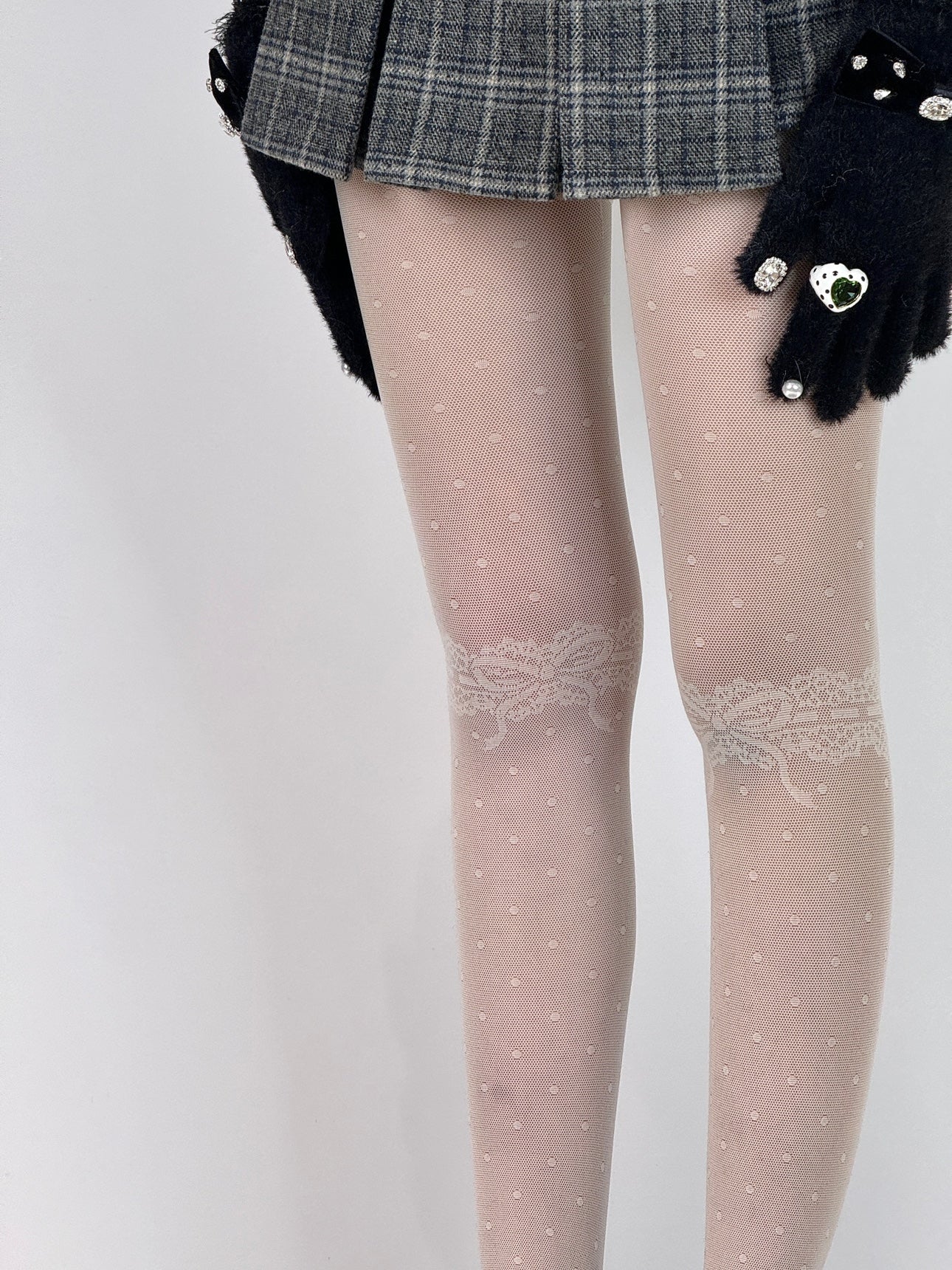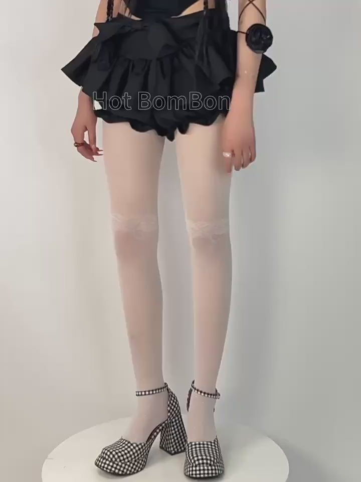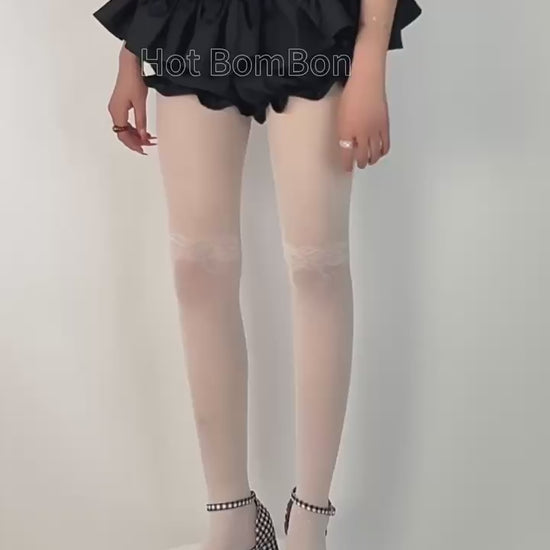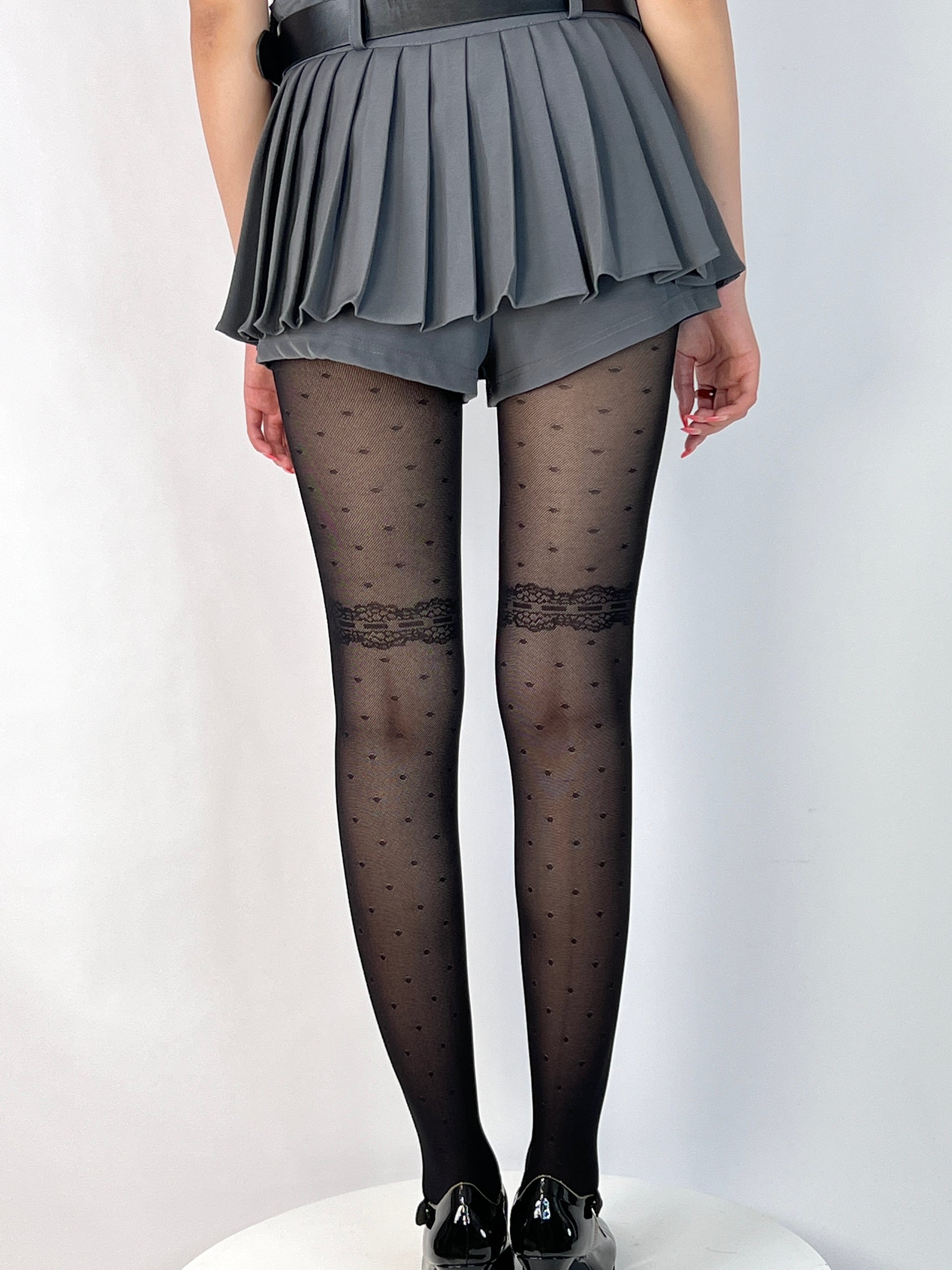 These elegant sheer tights feature a beautiful patchwork design with delicate lace at the thighs and playful polka dots throughout. The lightweight, breathable material makes them perfect for adding a touch of romance and sophistication to any outfit, whether paired with a dress, skirt, or layered under shorts.
