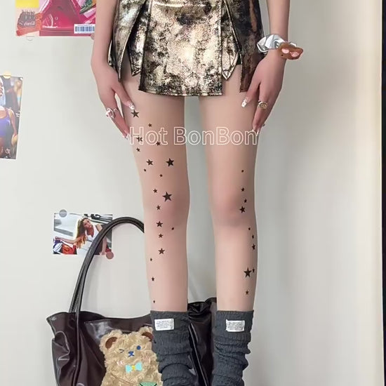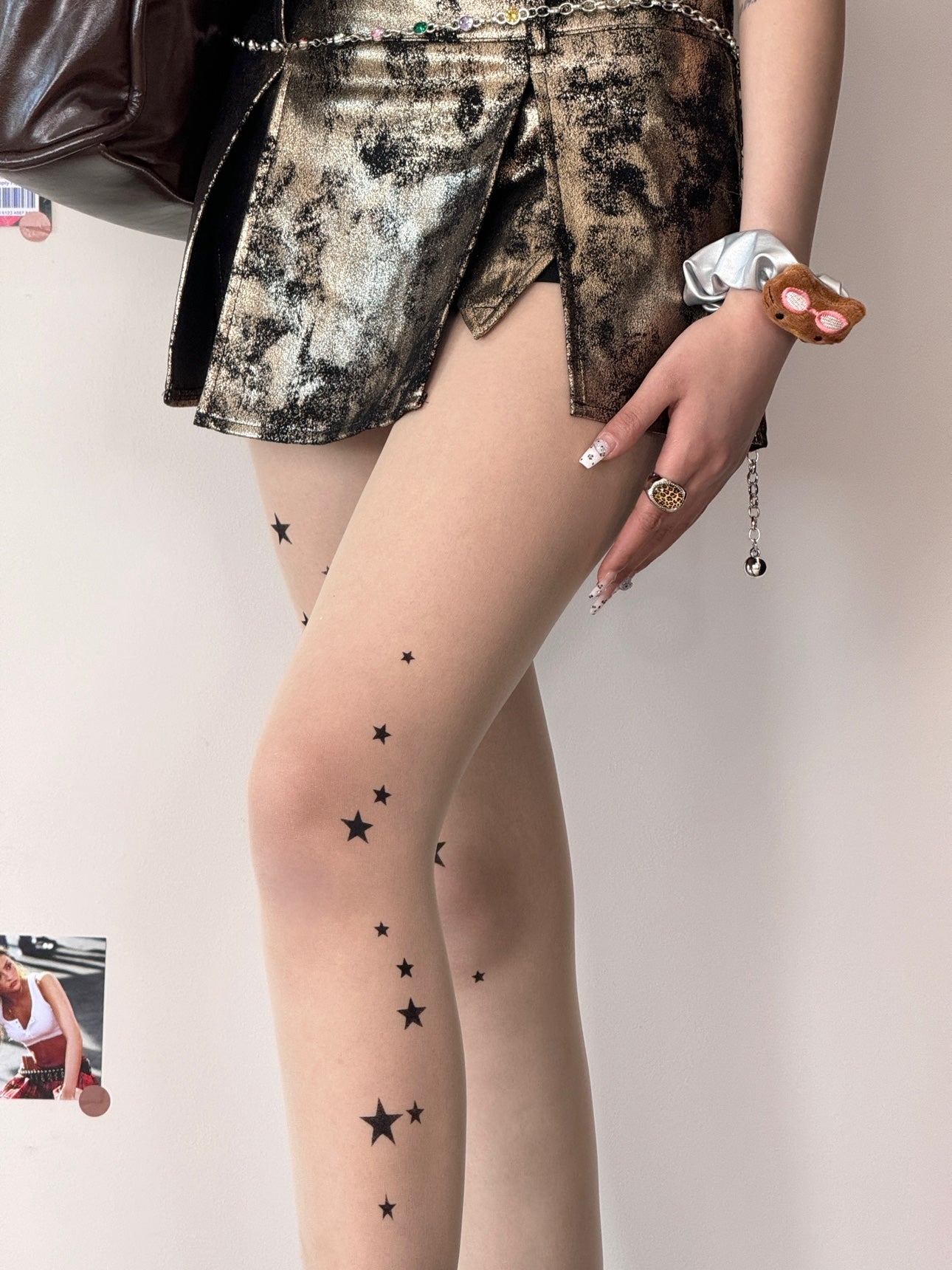 These sheer nude tights with a sprinkle of stars are a must-have for any wardrobe! The delicate star pattern adds a subtle yet charming touch to your look, making them perfect for pairing with dresses, skirts, or even shorts.